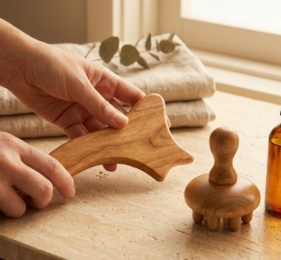 Professional wooden tools to sculpt contours and release deep stagnation.